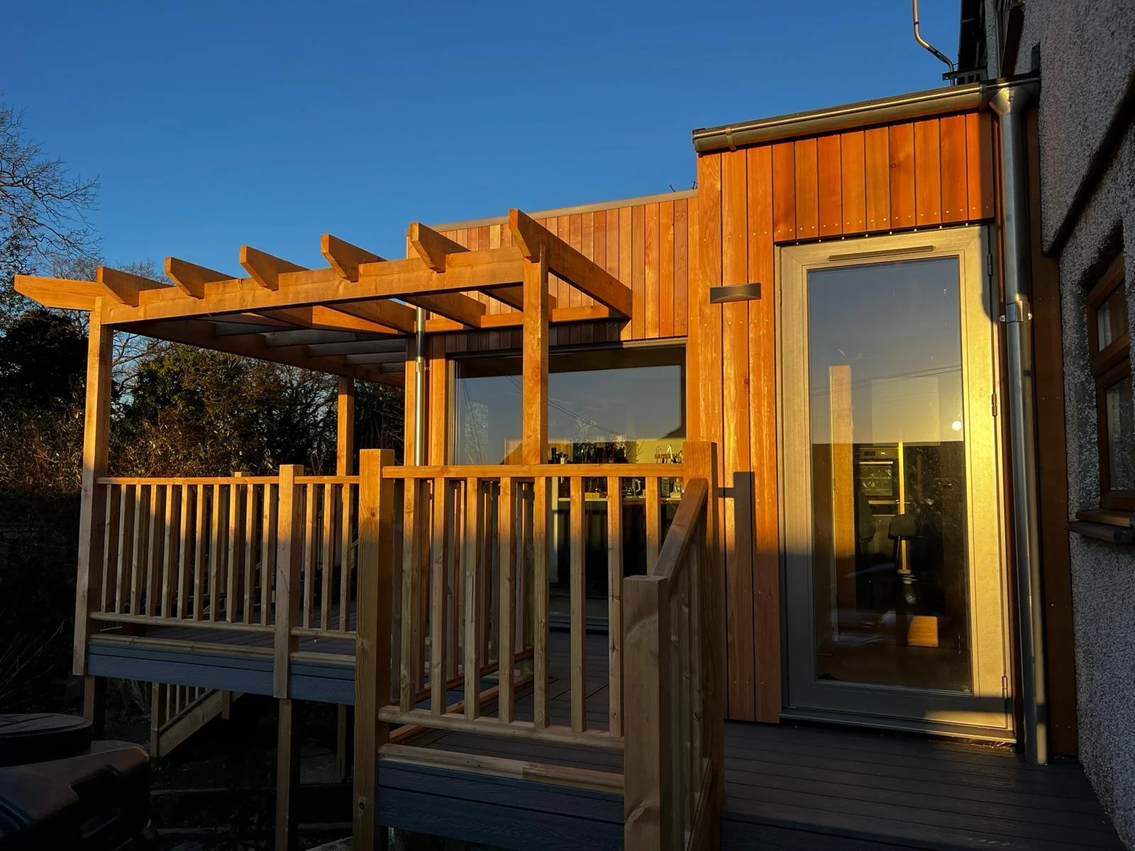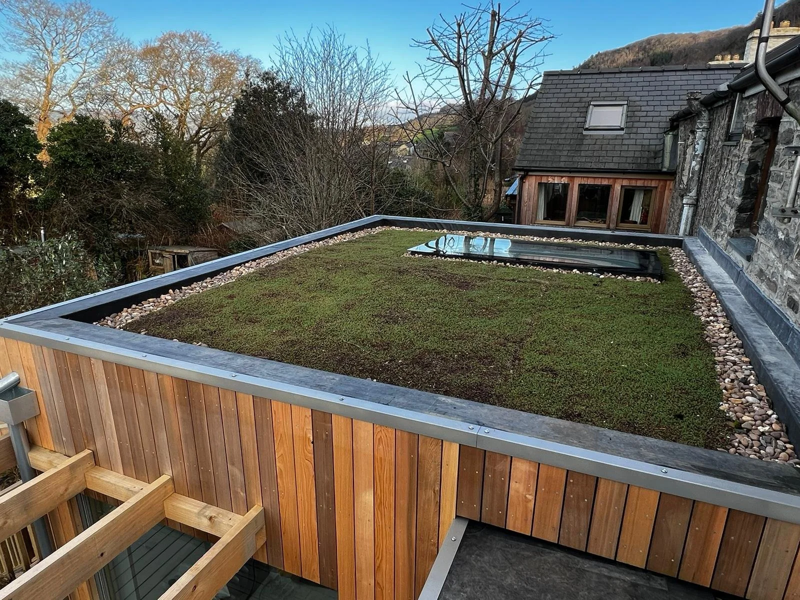 02 / TaliesinA rear extension to a domestic property, designed to create an open plan kitchen. The structure features a steel frame with well-insulated timber frame infill, alu-clad windows and doors, timber cladding, and a green roof.